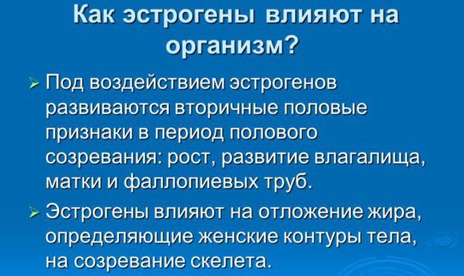 — стимулируют развитие матки, маточных труб, влагалища, молочных желез, пигментацию в области сосков и половых органов, формирование вторичных половых признаков по женскому типу, рост и закрытие эпифизов длинных трубчатых костей.