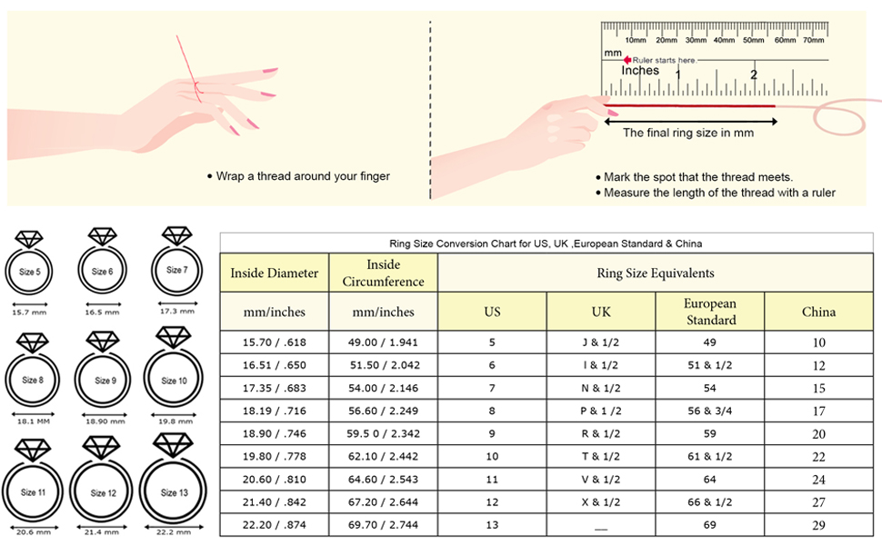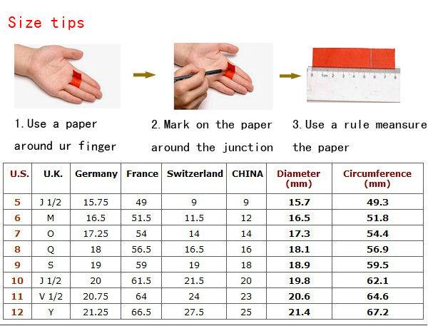 Для того, чтобы определить размер кольца, на Алиэкспресс предусмотрена инструкция, с помощью которой можно определить диаметр кольца и точно подобрать кольцо по размеру. Есть множество способов, как выбрать размер кольца, которые позволяют максимально точно измерить окружность пальца и уже по ней выбрать размер. Самый простой способ, как подобрать кольцо по размеру, это взять отрезок нити и обернуть ее вокруг пальца по выступающей части, то есть на месте изгиба фаланги, затем отрезать фрагмент, который соответствует окружности и сопоставить этот отрезок с линейкой.