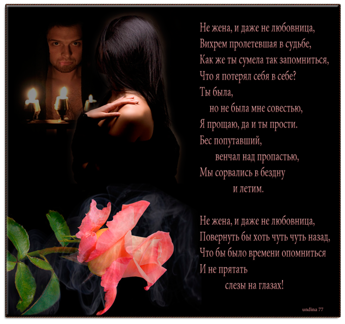 Женатых любовников у меня было двое. Первый — творческая личность, ему жена наскучила, быт (она только-только родила). Искал на стороне любви и восхищения, которых не хватало дома. Все свободное время проводил со мной, включая выходные и праздники. Жена сидела дома с ребенком. Врал, что с друзьями на очередной художественной тусовке. Она верила, какая-то дура не от мира сего была, а он эгоист. Ну что тут посоветовать? Думаете, если художник, то на уме у него одно творчество с вдохновением? Видала я его вдохновение — в постели.