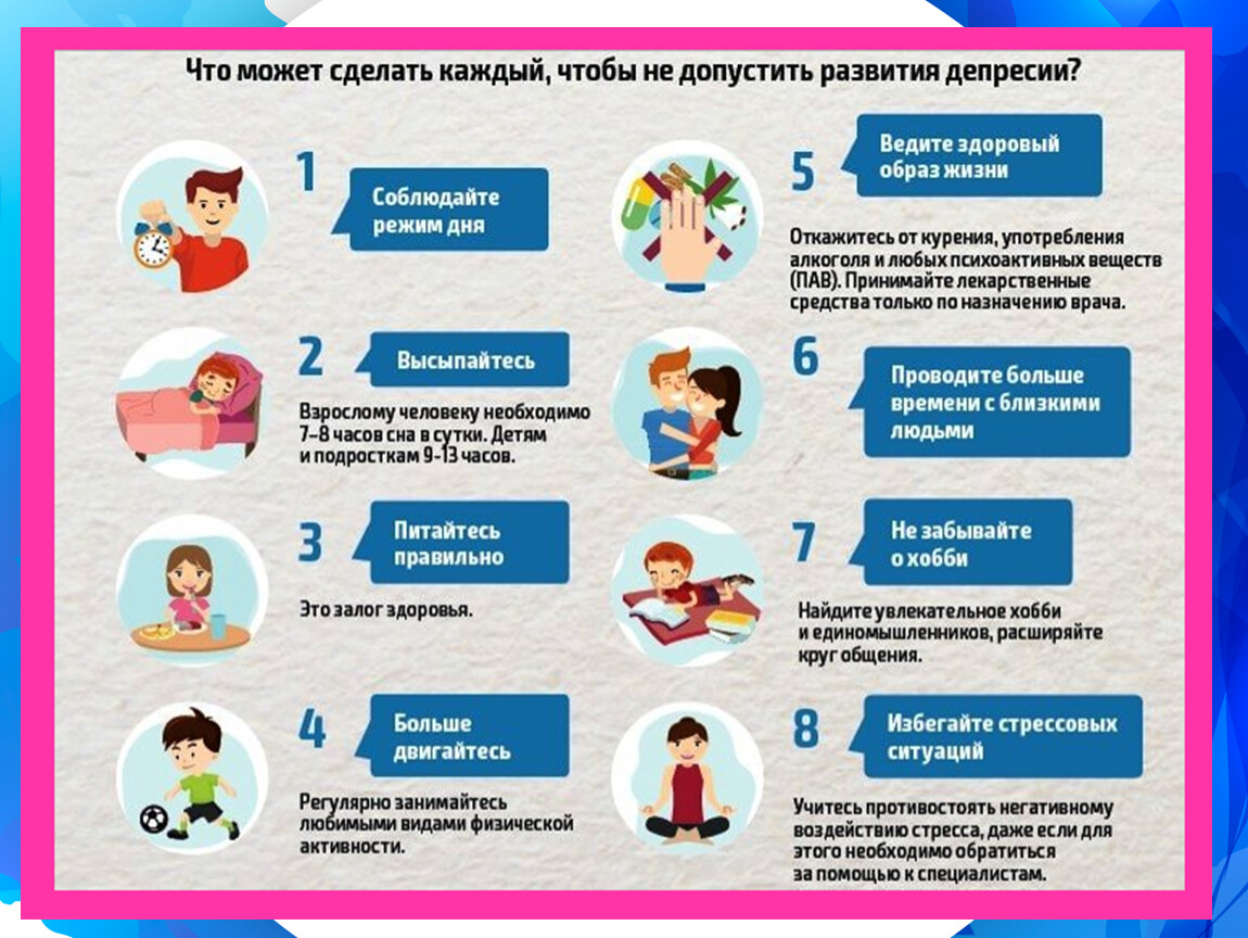 Переведенные документы любезно предоставлены сотрудниками CooperSurgical Inc. 054 Последнее рассмотрение: март 2019 г. Поговорите с хорошим слушателем. Это может быть друг, родственник, волонтер или профессионал. Если этого недостаточно, профессионалы могут предложить специальные способы общения, в том числе: Психотерапия: поможет вам понять, как ваша депрессия может быть связана с тем, что с вами произошло в прошлом. Когнитивно-поведенческая терапия: помогает понять, как некоторые способы вашего мышления или поведения могут вызывать у вас депрессию. Затем это поможет вам мыслить более реалистично, что заставит вас чувствовать себя лучше. Они очень безопасны. Но иногда психотерапия может вызывать неприятные воспоминания из прошлого. Хороший психотерапевт знает, как с этим справиться. Если у вас есть проблемы, вам следует обсудить их со своим лечащим врачом или терапевтом. Ваш врач общей практики или другой специалист может организовать подобное лечение, хотя может существовать список ожидания. Местные организации и благотворительные организации могут бесплатно предоставлять консультации или терапевтические беседы. Спросите своего врача общей практики, что доступно на месте. Если ваша депрессия была вызвана тяжелой утратой или проблемами в отношениях, вам может помочь консультирование по поводу утраты или терапия для пар. Если у вас депрессия и плохой сон, плохой аппетит и потеря веса (или переедание и увеличение веса), или депрессия продолжается в течение длительного времени, ваш врач часто предлагает антидепрессант. Приблизительно 50-60% людей, принимавших эти таблетки, обнаруживают, что они помогают. В настоящее время доступно несколько типов антидепрессантов, поэтому вы сможете найти тот, который вам подходит. В первые несколько дней вы можете чувствовать тошноту или тревогу, но эти эффекты обычно проходят. Некоторые могут вызывать у вас сонливость или сухость во рту. Иногда они могут мешать другим лекарствам, но ваш врач будет знать об этом. У пожилых людей антидепрессанты могут снизить количество соли (натрия) в крови, что может вызвать слабость и неустойчивость. Примерно у 1 из 3 человеков могут возникнуть симптомы отмены, если они внезапно прекратят прием этих лекарств. Антидепрессантам нужно 1 или 2 недели, чтобы начать действовать. Вы можете обнаружить, что им требуется от 6 до 8 недель, чтобы они действительно изменили ситуацию. Не садитесь за руль, если они вызывают у вас сонливость или замедляют вашу реакцию — если это произойдет, сообщите об этом своему терапевту.