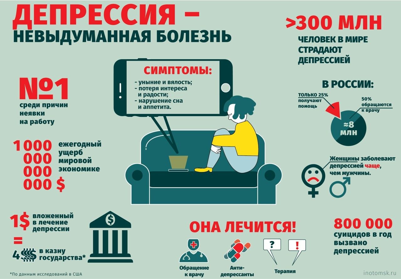 Согласно Всемирной организации здравоохранения (ВОЗ), депрессией страдают около 350 миллионов человек по всему миру. Лечение получают менее 50% из них, а в некоторых странах — менее 10%. Многие больные не обращаются за помощью, не подозревая о наличии заболевания и обвиняя себя в лени или скверном характере.