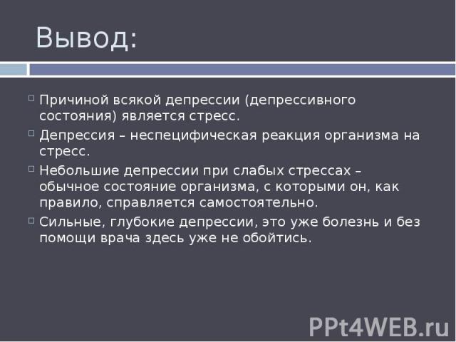 Работа выполняется медленнее. - Двигательная заторможенность. Депрессию всегда сопровождает постоянное чувство усталости. Заставить себя пойти куда-то в таком состоянии крайне сложно.