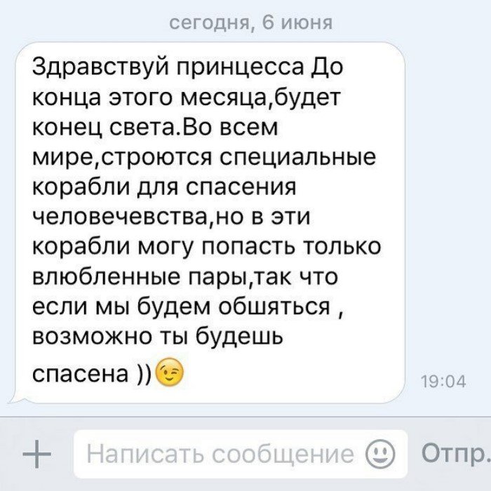 Симпатичной девушке приходят десятки таких сообщений, и если ты внешне не похож на голливудского красавца, шансов у тебя маловато. Значит, нужно проявить индивидуальность с первых строк.