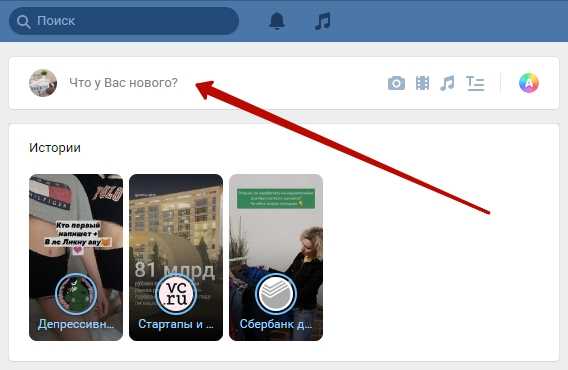Откройте приложение ВКонтакте на своём смартфоне. На главной странице, вверху нажмите по полю Что у Вас нового?