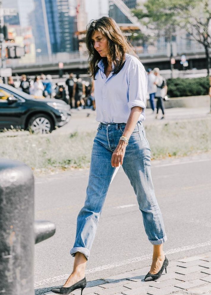 Эту формулу наряда невероятно легко собрать. Заправьте простую рубашку в любимые джинсы, и вперед! Выглядеть отполированным с минимальными усилиями — это всегда движение.
