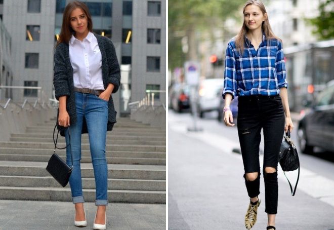 Заправленный вариант подойдет для офиса, школы и делового стиля, остальные способы — для отдыха и прогулок. Любой из тандемов можно сделать оригинальным, используя нестандартные аксессуары, либо своеобразный вариант ношения (фото ниже).