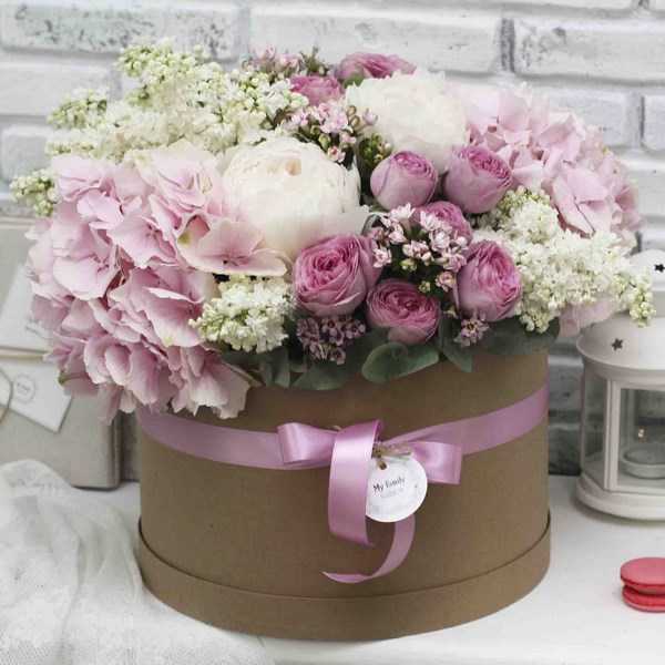 Изысканно смотрятся букеты в коробке с гортензиями, дополненные другими цветами. Соцветия гортензии превосходно дополняют любые композиции из живых цветов.