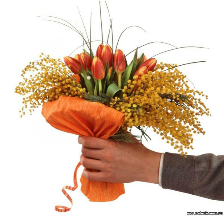 Конечно же, с улыбкой и теплыми словами! При вручении букет держите в левой руке бутонами вверх. Правая же рука, согласно этикету, должна быть свободна для приветствия. Доставляйте букет до места назначения, опустив цветками вниз, на улице постарайтесь защитить его от ветра и мороза. Если упаковка не является декоративным дополнением к букету, перед вручением ее нужно снять.