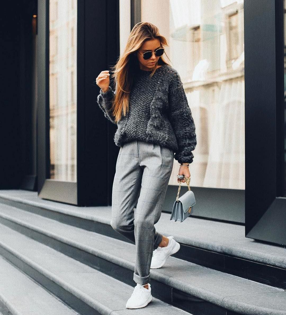 Если к прямым классическим брюкам добавить толстовку спортивного кроя в стиле оверсайз, то получится оригинальный look в стиле кэжуал.