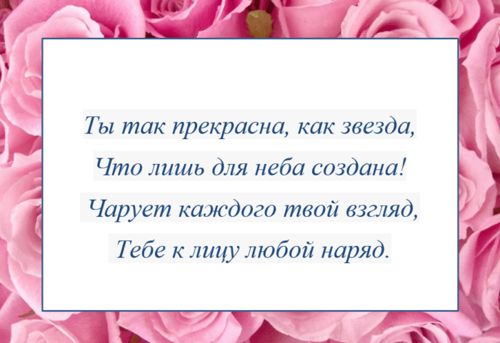 - Комплименты в стихах . Не пытайтесь облечь комплимент в стихи, особенно если не умеете. Во-первых – это старомодно. Во-вторых – очень на любителя, так как даже если вы чего-то стоите как поэт, не все любят стихи.