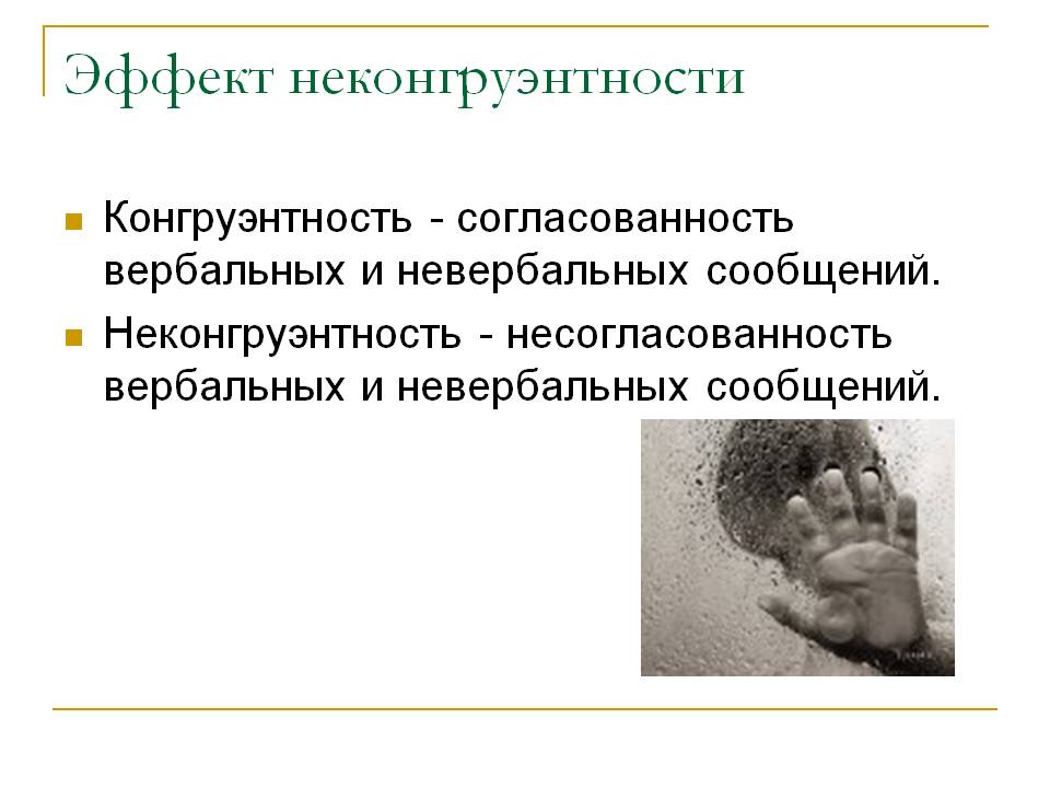 В этом смысле говорят о конгруэнтности (или неконгруэнтности) вербальной или невербальной информации, конгруэнтности его слов и его дел, конгруэнтности его состояния и того, что он показывает окружающим, соответствия его жизненных ценностей и того, как человек живет в реальности.