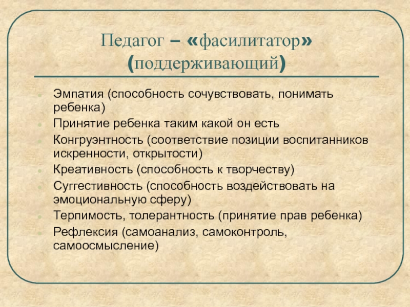 Это также значит, что он принимает свои настоящие чувства. Таким образом, он становится откровенным в отношениях с учениками. Он может восторгаться тем, что ему нравится, и скучать в разговорах на темы, которые его не интересуют. Он может быть злым и холодным [учитель?! — С.С] или, наоборот, чувствительным и симпатизирующим. Поскольку он принимает свои чувства как принадлежащие ему , у него нет необходимости приписывать их ученикам или настаивать, чтобы они чувствовали то же самое. Он — живой человек , а не безличное воплощение требований программы или связующее звено для передачи знаний» (там же, с. 347-348).