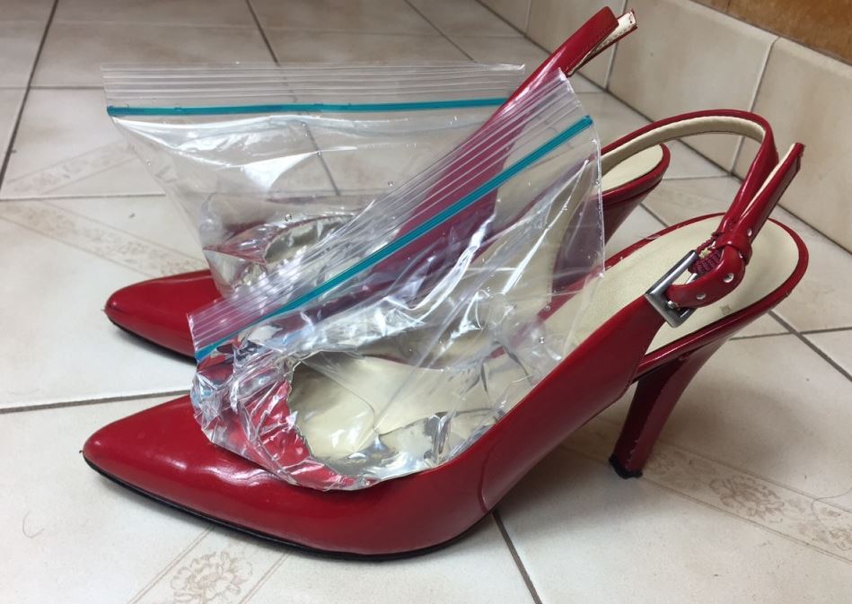 В пару тесной обуви помещаем два полиэтиленовых пакета, куда наливаем воду. Нужно заполнить жидкостью пакет так, чтобы вода была по всей длине, начиная с носка и до задника обуви. Пакеты завязываем и помещаем обувную пару в морозильную камеру — лучше на ночь.