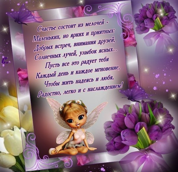 Я рад, что в моей жизни появилась такая добрая и восхитительная девушка. В свой день, не забудь загадать желание, которое обязательно сбудется, а все сказанные тебе пожелания приумножаться. Любви неземной, веселых и надежных друзей, здоровья и финансового подъёма.