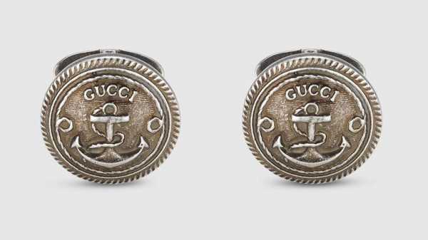 Примечательно, что всю свою прощальную коллекцию для Gucci бывший креативный директор модного дома Фрида Джанни посвятила морским мотивам. В сезоне весна/лето 2015 мужчинам она предложила одеваться в подвернутые на моряцкий манер брюки и джинсы, адмиральские пальто и двубортные пиджаки в стиле капитанского кителя. Если обувь, то лоферы и парусиновые туфли и только – на босу ногу. А от бело-голубых полосок при просмотре мужской коллекции Gucci минувшего сезона и вовсе рябит в глазах. Коснулось помешательство морским стилем и аксессуаров марки. В частности, в каталоге бренда мы нашли круглые запонки с реалистично выполненными якорями и узором по краю, напоминающим морской канат. Аксессуар изготовлен из серебра, покрытого палладием. С рождественской скидкой на сайте Gucci эти запонки стоят 145 фунтов (обычная цена 290 фунтов).