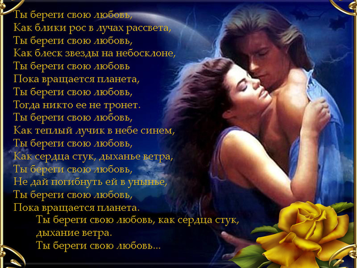 Люблю ли я тебя?! Как можно любить или не любить свою душу, свою судьбу, свое будущее и настоящее? Все, что было в моей жизни до тебя, как будто было не со мной. Для меня важно лишь то время, которое я провожу с тобой или в ожидании нашей встречи. Будущее для меня имеет значение, если только рядом со мной будешь ты. Я хочу положить к твоим ногам Вселенную, мир и свою душу. Самые нежные слова не способны выразить все то, что я ощущаю, что я хочу для тебя сделать. Я так хорошо знаю каждую черточку твоего лица, что достаточно на секунду взглянуть, чтоб понять твое настроение и желания. Пусть так будет всегда. Твоя рука крепко держит мою, а твое сердце бьется в унисон с моим. Теперь ты понимаешь мои чувства?