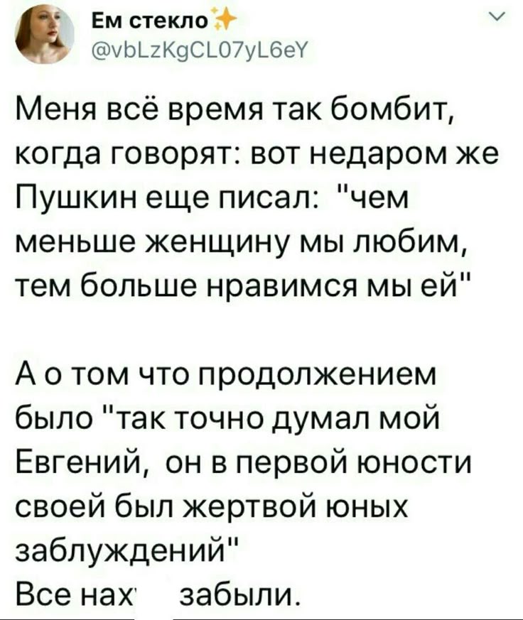 Начнем, пожалуй, с истории. Эту фразу написал А. С. Пушкин в одноименном романе в стихах «Евгений Онегин». И звучать она должна так: «Чем меньше женщину мы любим, тем легче нравимся мы ей». Но люди, почему то перекрутили ее на «Чем меньше женщину мы любим, тем больше нравимся мы ей». Только почему — я никак не могу понять. Ну да ладно, суть не в том.