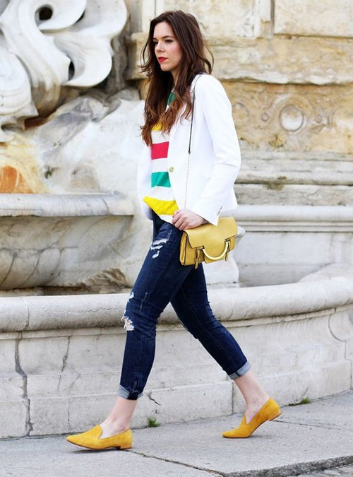 Вот повседневная и свежая одежда, которую можно носить как в уличном, так и в деловом стиле. Для верха просто наденьте белую облегающую футболку с рукавом три четверти и белый шарф. Сочетайте их с синими джинсами скинни и парой золотых лоферов с эффектом металлик, чтобы добавить блеска доступному образу.