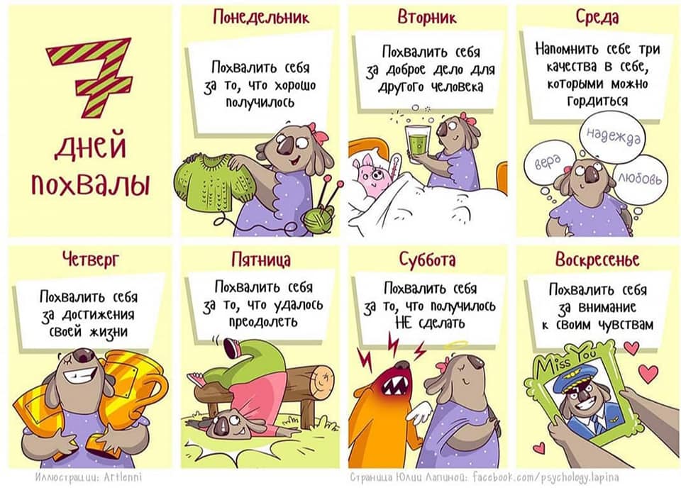 Тот, кто себя любит — хорошо знает и помнит свои сильные стороны, свои достоинства. Многим нужно учиться и этому, и иногда легче начать с того, чтобы замечать достоинства в окружающих людях. Возьмите себе в работу писать каждый день десять новых достоинств своих и десять достоинств кого-то из своих близких, знакомых или коллег по работе. Когда вы в любую секунду будете знать, что вы достойный человек, живущий среди достойных людей, любить себя оказывается проще.