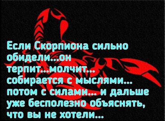 Если вы расстроите Скорпиона, то можете ожидать, что он достанет свое жало — что может выражаться в человеческой форме темпераментных срывов и споров — чтобы заявить о себе. Не волнуйтесь, они делают это только тогда, когда у них нет другого выбора. Злость обычно является их последним средством самообороны (разве не то же самое для всех нас?).