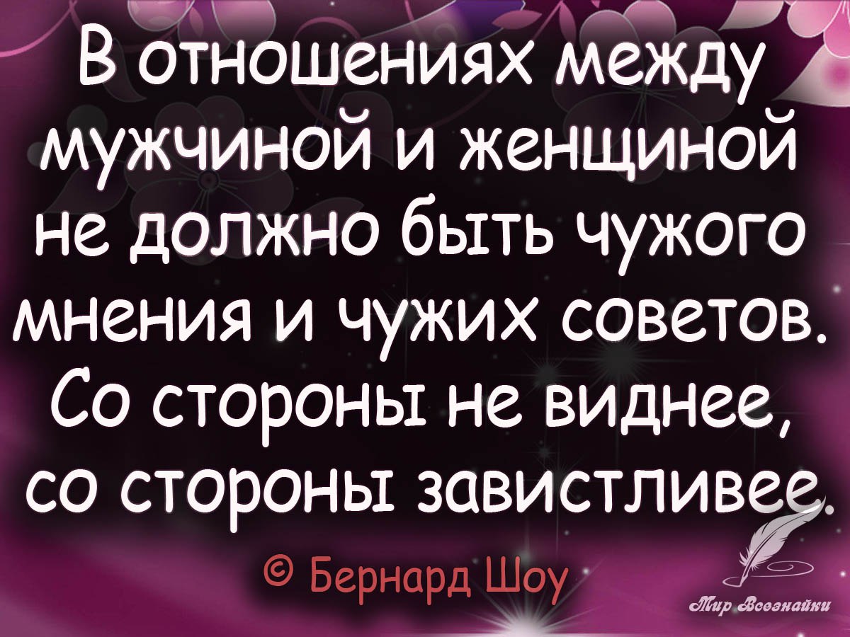 В отношениях между мужчиной и женщиной не должно быть чужого мнения и чужих советов.