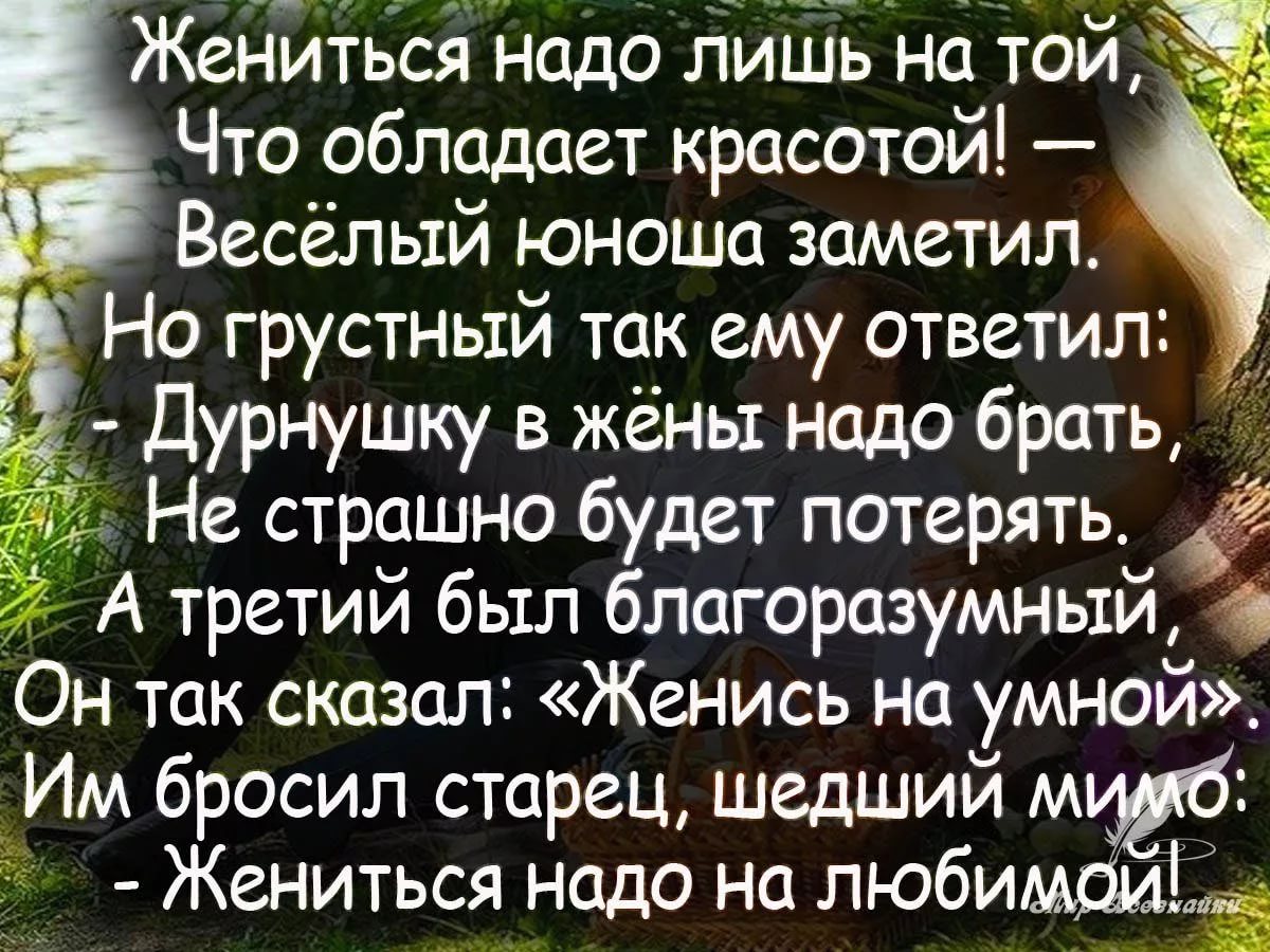 Женись, несмотря ни на что. Если попадется хорошая жена, Будешь исключением, а если плохая — станешь философом.