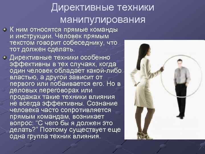Манипуляция — это неконструктивный метод психологического давления на людей, где сам манипулятор при помощи скрытых действий (оскорбления, агрессия) добивается необходимых для него действий.