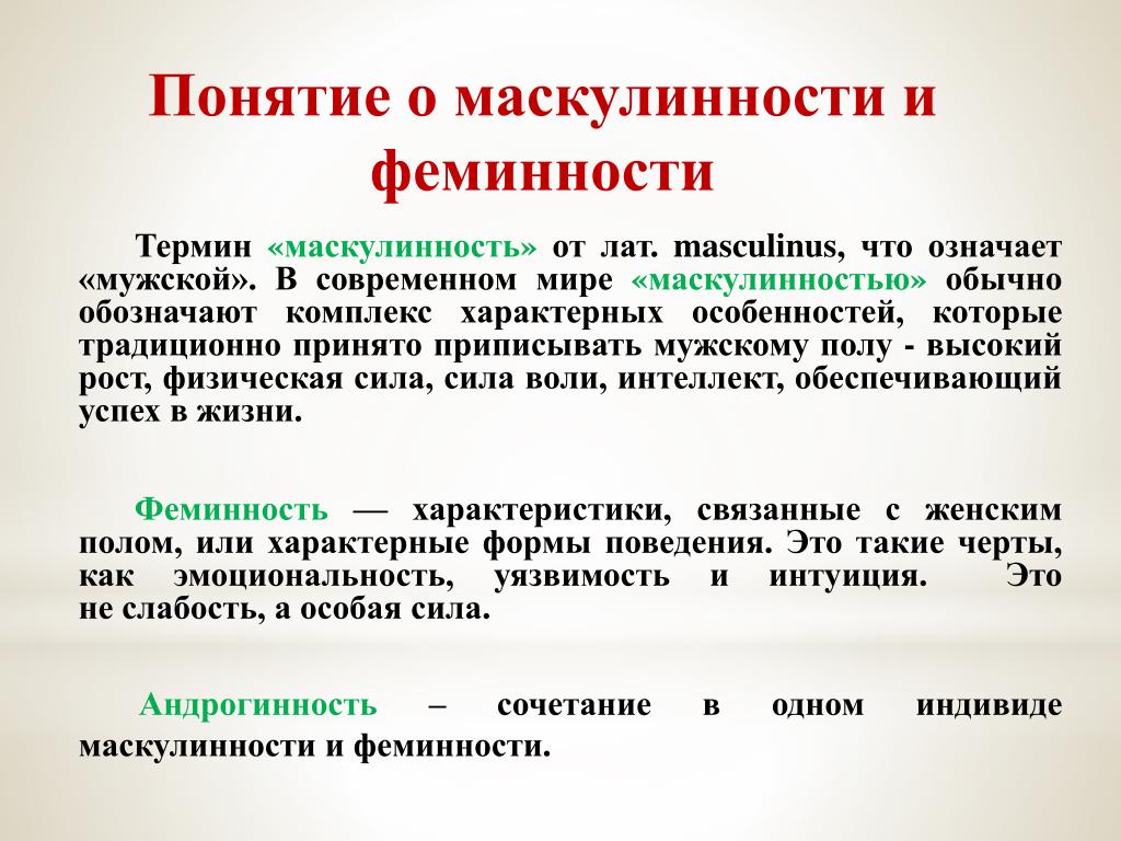 маскулинность — и ФЕМИНИННОСТЬ (от лат. masculinus мужской и femininus женский) нормативные представления о соматических, психических и поведенческих свойствах, характерных для мужчин и для женщин; элемент полового символизма, связанный с дифференциацией половых … Большая психологическая энциклопедия