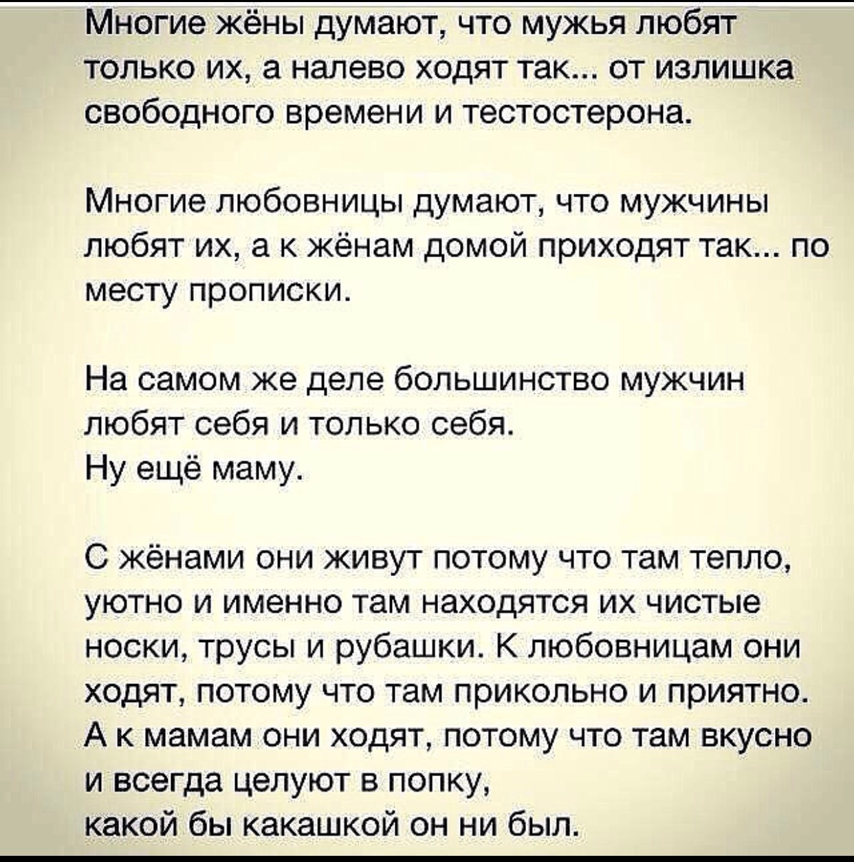 разу ей не изменил , без ВП , любил , помогал во всем. Я страдал почти пол года, но теперь все осознал и понял, что есть тип женщин ЛЮБОВНИЦЫ и на них нельзя женится, с ними хороший секс и путешествия совместные,
