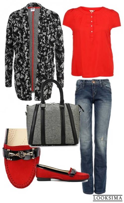 - Красные мокасины и джинсы, отличное и универсальное решение для повседневного образа.