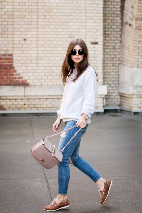 Несмотря на демократичный внешний вид, мокасины не являются спортивной обувью, в отличие от кед или слипонов, поэтому со спортивным костюмом их не носят. Зато универсальные джинсы и мокасины смотрятся вполне гармонично. Это повседневный вариант, когда нужно быстро добраться от одной точки города в другую. Мокасины имеют прорезиненную подошву с шипами, что обеспечивает мягкую ходьбу, а небольшой каблук позволяет, в отличие от балеток, равномерно распределять нагрузку по всей стопе. Мягкая дубленная кожа и ли замша превращают мокасины в комфортную пару обуви, в которую хочется переобуться, сняв босоножки на каблуках. Хорошо смотрятся скинни или джинсы-бойфренды с отворотами. Они как нельзя кстати придутся для повседневного стиля, а в качестве верха можно выбрать майку, джемпер или топ.