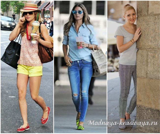 Когда достаточно прохладно, чтобы ходить в босоножках, и не хочется взбираться на высоченные каблуки, на помощь придут мокасины. К цветным брюкам лучше подбирать модели контрастного цвета: к тёмным оттенкам — белую обувь, а к светлым брюкам мокасины ярких оттенков, сиреневого, розового, голубого, жёлтого. Прохладным вечером сверху можно накинуть жакет или кофту, либо надеть пуловер или джемпер. Длинноногим девушкам подойдут брюки-дудочки длиной до щиколотки. Клёш не будет смотреться, потому что скроет саму обувь.
