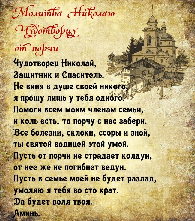 На окияне-синем море есть остров, на этом на острове есть камень, на этом камне стоит собор, в этом соборе — престол. За этим престолом орел-батюшка Владимир, Илья-Муромец и мать Пресвятая Богородица. Пришла я к вам попросить и умолить от колотья, от ломотья, от нытья, от девки-простоволоски, от мужика-колдуна, от дикого глаза, от ветряного защитить меня, рабу божию (имя)».