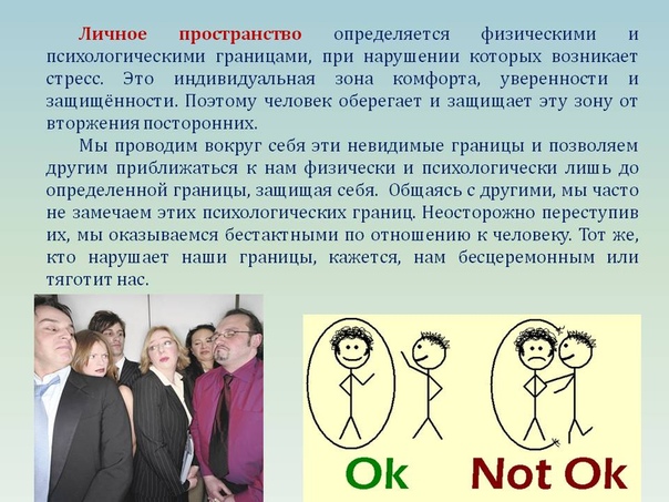 В широком смысле личное пространство – это время, занятия, чувства, мысли, которые мы временно или постоянно не хотим делить с другими.