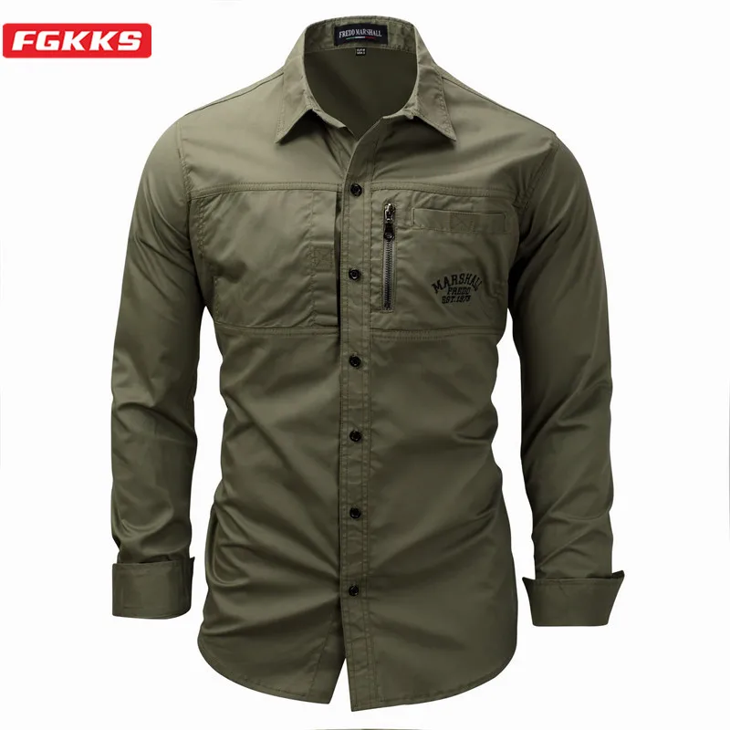 Рубашка в стиле милитари для мужчин однотонная из 100 хлопка с длинным рукавом и вышивкой мужская