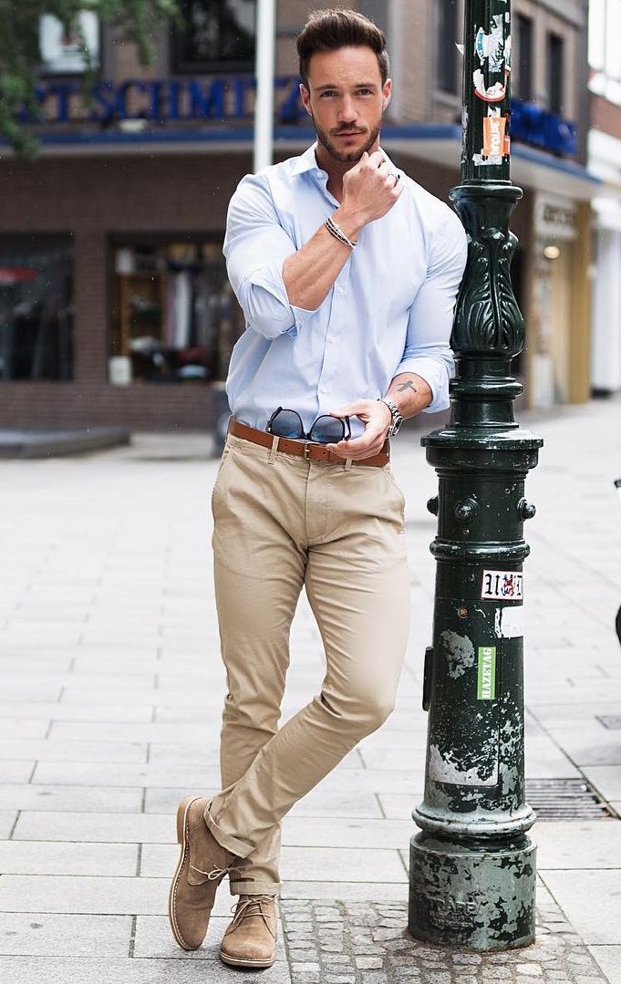 Синяя рубашка с брюками хаки или брюками чинос может показаться клише, но ваш ансамбль выглядит утонченным и элегантным, если он идеально подходит.
