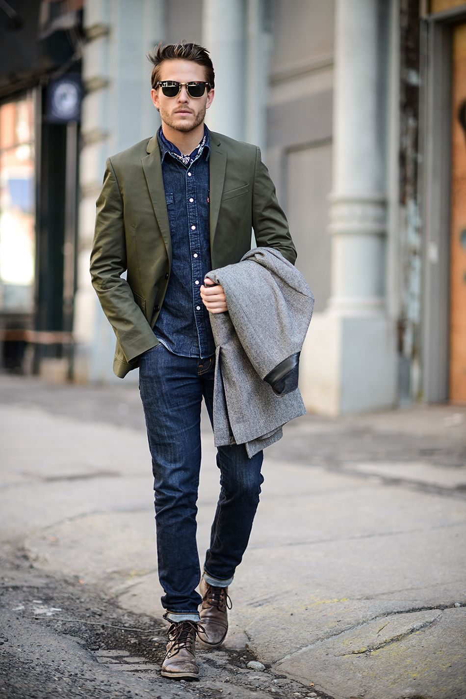 Отличный сет — потертые темно-серые джинсы, песочного оттенка кофта из тонкого трикотажа и черная куртка длиной до середины бедра. Что же касается обуви, то здесь все зависит от личных предпочтений мужчины и его желания выделяться на фоне унылого пейзажа. Можно выбрать как черные, так и коричневые или ярко-рыжие ботинки на шнуровке и тракторной подошве.