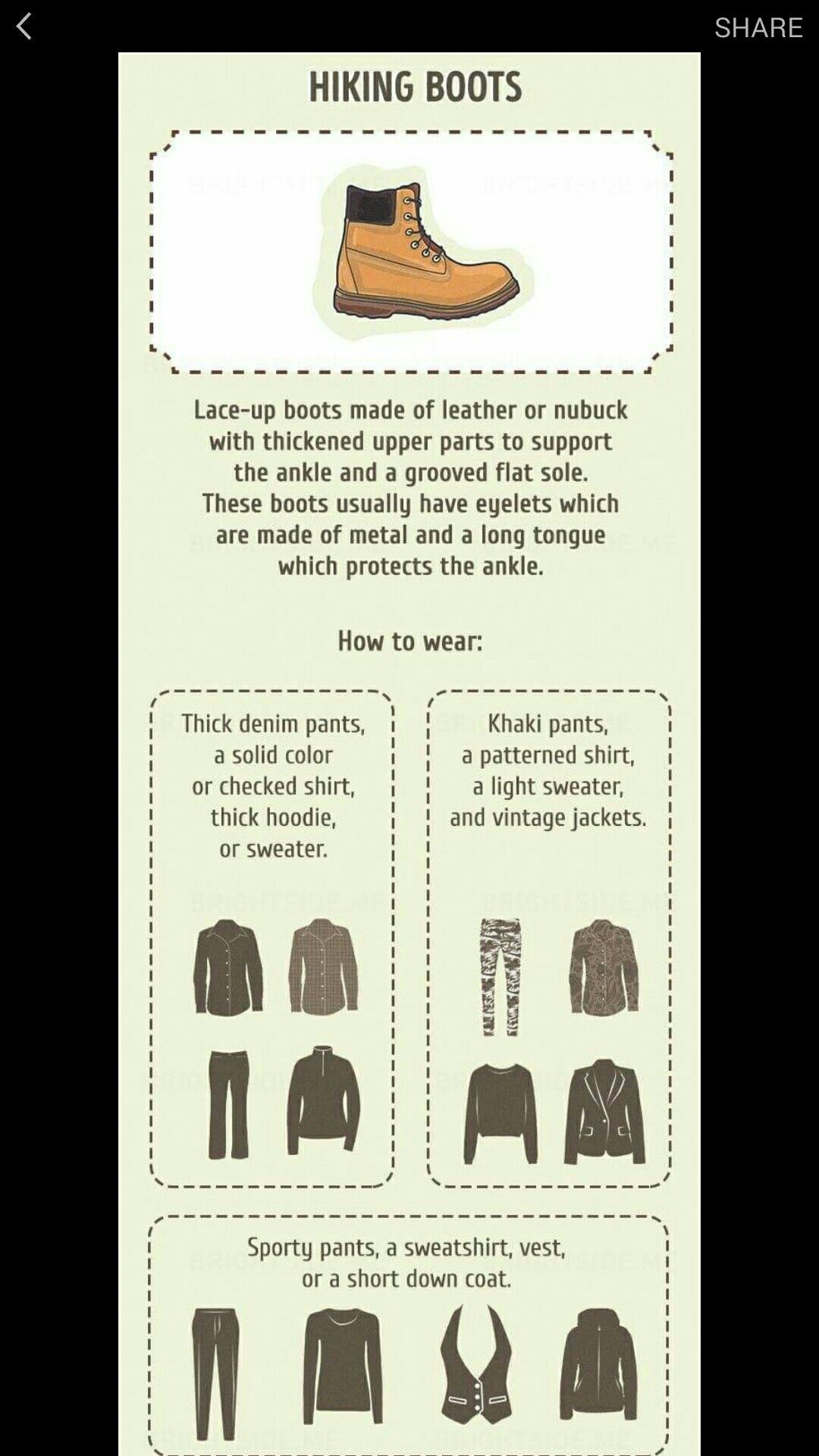Ботинки для ходьбы имеют воротник вокруг щиколотки для дополнительной поддержки. и для ходьбы по дождю и грязи. Они созданы для серьезных походов, а не просто для бездельничанья. Обувь для ходьбы сохраняет функциональность и удобство прогулочных ботинок, но менее неуклюжая и коренастая и, как правило, более эстетична.