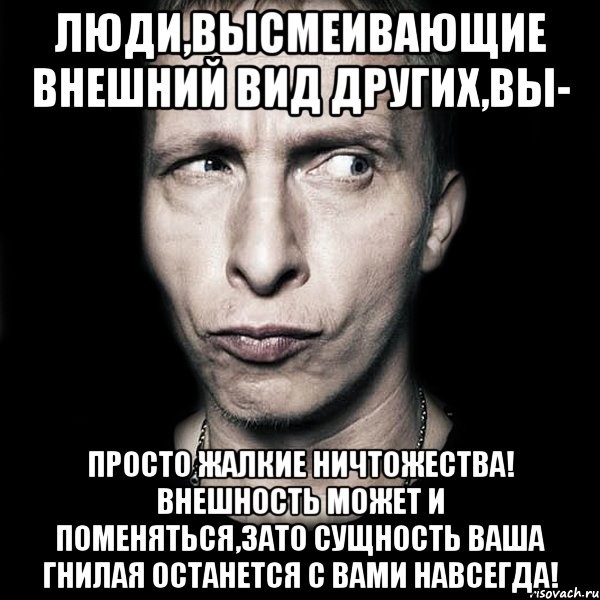 Вы издеваетесь??? При чем тут Бельмондо и Челентано??? У них внешка намного выше среднего, просто брутальные образы в кино и стиль… Возьмите обычного лысеющего мужика с мордой 6х6, без подбородка, с заплывшим лицом, маленькими впалыми глазами, с носом картофелиной, губами маленьким бантиком и кривыми во все стороны зубами.