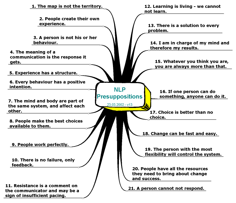 Убеждения клиента относительно себя и мира могут быть разрушительными и неверными. Если клиент считает, что «он не может», он, конечно же, не поверит. В качестве коучей использование техник нейро-лингвистического программирования, таких как пресуппозиции, полезно для внесения изменений в клиента, демистифицируя его с помощью любопытства, наблюдений и выяснения текущего состояния клиента, чтобы перейти к желаемому состоянию.Коуч использует эти техники, чтобы подтолкнуть клиента к самоисследованию. Здесь клиент развивает способность изучать свое текущее состояние ума и предположения и учится вносить изменения, чтобы расширить свою систему взглядов. Коуч, который использует и практикует 14 предпосылок, создает возможности для сотрудничества с другими и вносит изменения. Эти 14 предпосылок формируют центральные принципы НЛП. Тренер, который изучает и практикует их, будет знать эти принципы на всю жизнь. «Люди делают лучший выбор, какой только могут в данный момент» и «Все действия имеют цель» — вот два таких примера предпосылок НЛП.