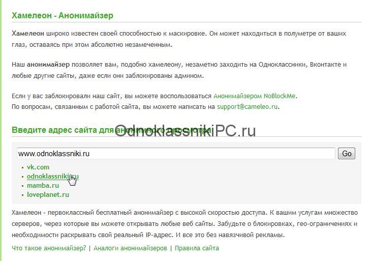 Первый вариант – это сайт http://cameleo.xyz/. Сервис позволяет включить доступ к социальной сети ВКонтакте, Одноклассники и т. д. Чтобы воспользоваться Хамелеоном, необходимо следовать инструкции: