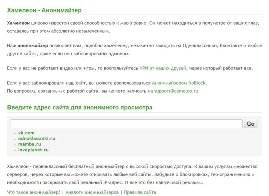 Хамелеон (cameleo.ru ) — бесплатный анонимайзер, сервис для посещения заблокированных сайтов Вконтакте, Одноклассники и др. Очень часто у пользователей сети Интернет возникает проблема с доступом к популярным сайтам. Причины проблем бывают разными, начиная с блокировки сайтов вирусами через файл , и заканчивая отключением доступа к развлекательным сайтам в офисах. Для обхода всех этих ограничений можно воспользоваться специальным сервисом — Хамелеон. Для того, чтобы зайти на любой сайт через анонимайзер, достаточно ввести адрес сайта и нажать кнопку GO. Для большего удобства пользователей, Хамелеон предлагает опцию быстрых ссылок. Для перехода на нужный сайт нужно просто нажать на ссылку с его названием. В быстрых ссылках сервиса находятся следующие сайты: odnoklassniki.ru, vkontakte.ru, dating.ru, loveplanet.ru и mamba.ru .