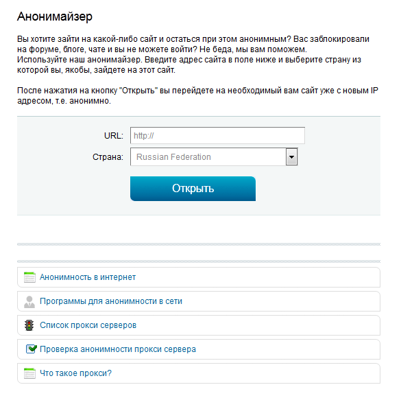 Анонимайзер — это ресурс, который помогает обойти любые запреты на посещение заблокированных сайтов и, кроме того, позволяет скрыть его от админов.