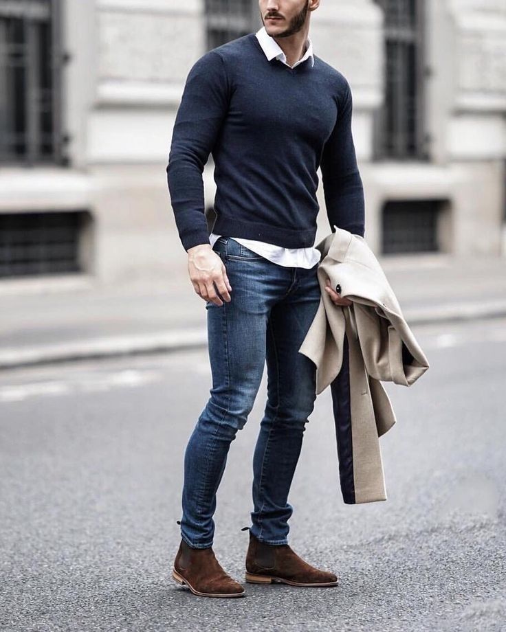 Свитера станут вашим лучшим другом в многослойности. Надев его под пиджак, но поверх классической рубашки, вы сможете выглядеть более повседневно или более официально, в зависимости от необходимости. Если это ситуация, когда вам нужно быть более формальным, вы можете снять свитер и просто надеть костюм. Если это случайный образ, вы можете отказаться от пиджака и галстука и просто надеть свитер и классическую рубашку.