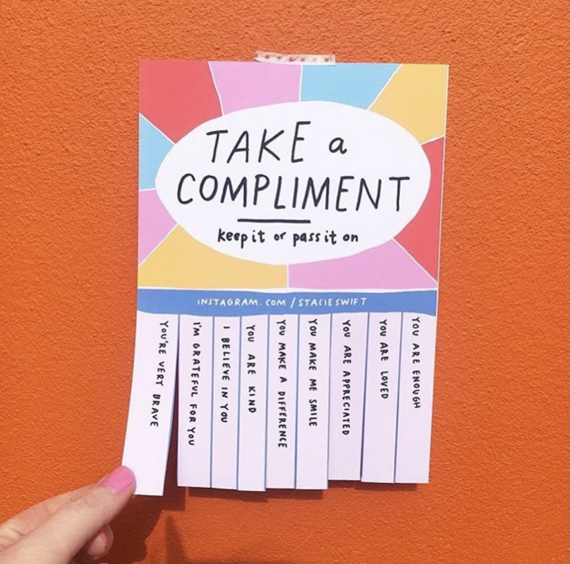 24 января — это также Национальный день комплимента ! Чтобы отпраздновать этот год, я сделала кучу открыток с разными комплиментами на одной стороне и наклейкой «Комплимент красивому человеку» — на другой. Я оставил их в небольшой пластиковой коробке, которую я прикрепил к столбу в городе, и они исчезли всего за несколько часов! Я очень надеюсь, что они вызвали улыбки на многих лицах и что открытками поделились с друзьями.