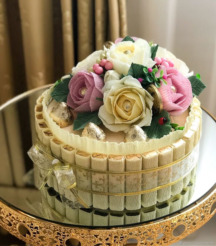 - Конфетный букет или набор сладких десертов из восточной страны. Популярный и креативный презент. Это отдельный вид искусства, на вид необычный и вкусный.
