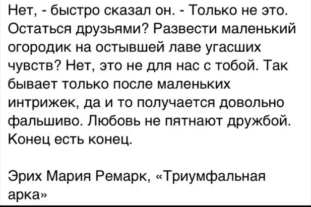 Принимая решение дружить с экс-возлюбленным, вы ступаете на достаточно зыбкую почву: дружба предполагает равенство ожиданий и намерений, а в отношениях с бывшими такое равенство часто оказывается невозможным. Действительно ли вы готовы стать другом для вашего бывшего любимого? Не скрывается ли за декларацией дружбы тайная надежда на то, что отношения вернутся в прежнюю колею? Или, что тоже не редкость, вы знаете, что на возобновление отношений надеется мужчина, и под прикрытием дружбы решаете держать его «на коротком поводке» — для развлечения и самоутверждения? Непременно решитесь на откровенный разговор и убедитесь в том, что ваши ожидания и чувства совпадают. В противном случае лучше поставить точку и разойтись — почти по Ремарку.