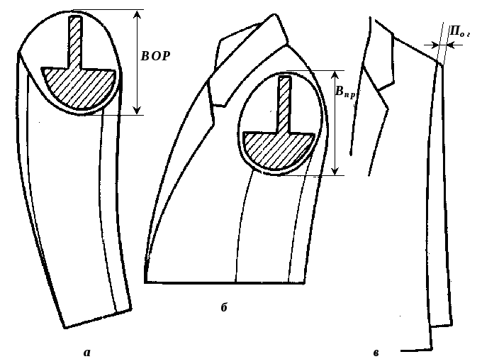 Перед пришивом рукава к пройме лифа по запасам швов пройм спинки и переда прокладываем две машинные строчки с ослабленной нижней ниткой. Подтягиваем срезы спинки на 0,4 — 0,6 см, а срезы переда на 0,6 — 0,8 см. Распределяем посадку по всему срезу равномерно и сутюживаем ее. В точке г₂ левой и правой сторон полочки по запасу на шов делаем надсечки, предварительно обметанные в петлю.