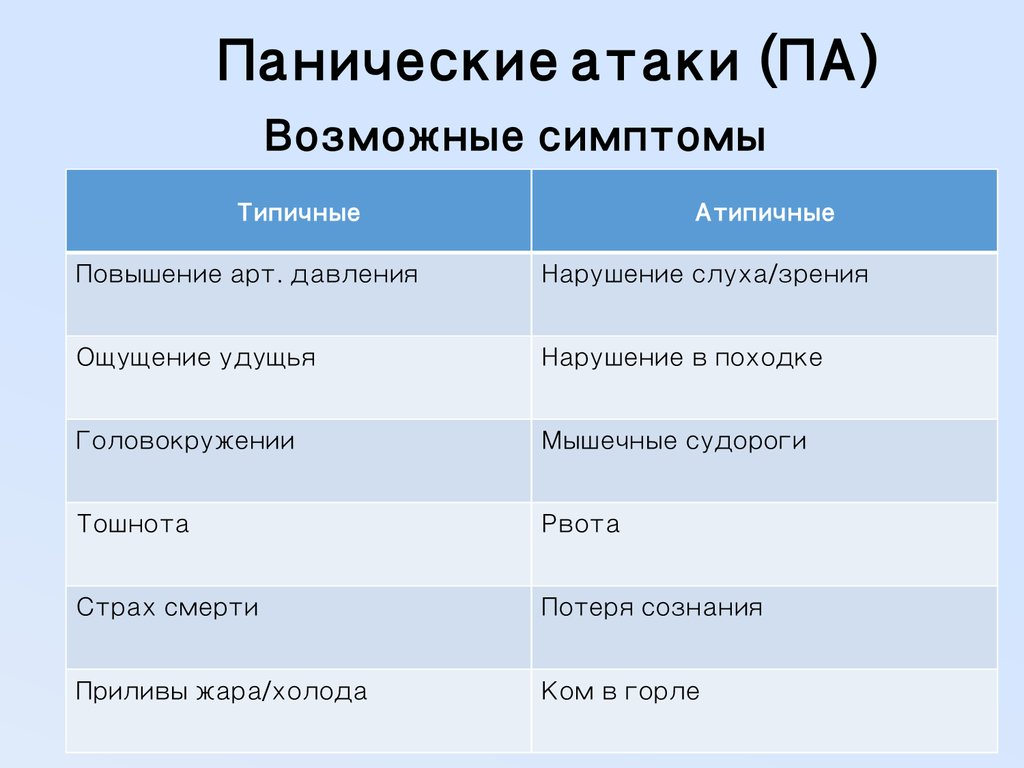– Симптомы ПА: ощущение беспричинного страха и паники, боль в груди, затруднённое дыхание, учащённое сердцебиение, повышенный пульс, повышение давления, головокружение, затуманенность сознания и т. д.