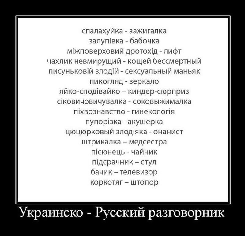 Новые украинские слова:: Гинеколог — пихвозаглядач; Парашютисты — падалки; Зажигалка — спалахуйка; Бабочка — залупівка; Подсчитай — пiдрахуй; Ужасы — жахи; Лифт — міжповерховий дротохід; Кощей бессмертный — чахлик невмирущий; Сексуальный маньяк — пісюнковий злодій; Зеркало — пикогляд; Киндер-сюрприз — яйко-сподівайко; Соковыжималка — сіковичовичувалка; Вертолет — гвинтокрил; Коробка передач — скринька перепихунців; Поджопник — пiдсрачник; Баскетбол — кошиківка; :grinning: — ОбсуждайПётр Русин